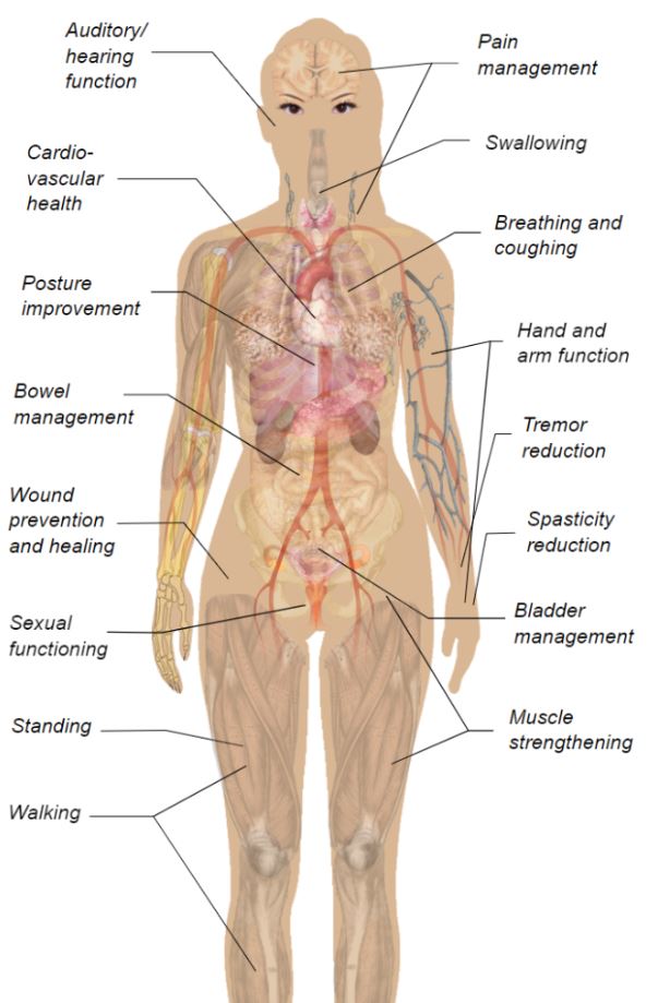 Electrical stimulation can be used to strengthen weakened muscles, improve sensory awareness, decrease spasticity, improve range of movement, decrease pain, and improve function.